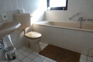 De badkamer op de onderste woonlaag is voorzien van ligbad en toilet.